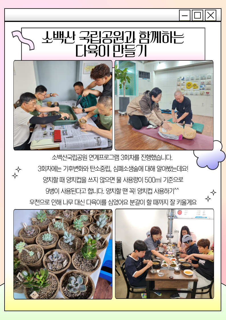 소백산국립공원 연계프로그램 3회차 내용으로 탄소중립과 기후변화, 심폐소생술에 대해 알아보는 시간을 가졌습니다.