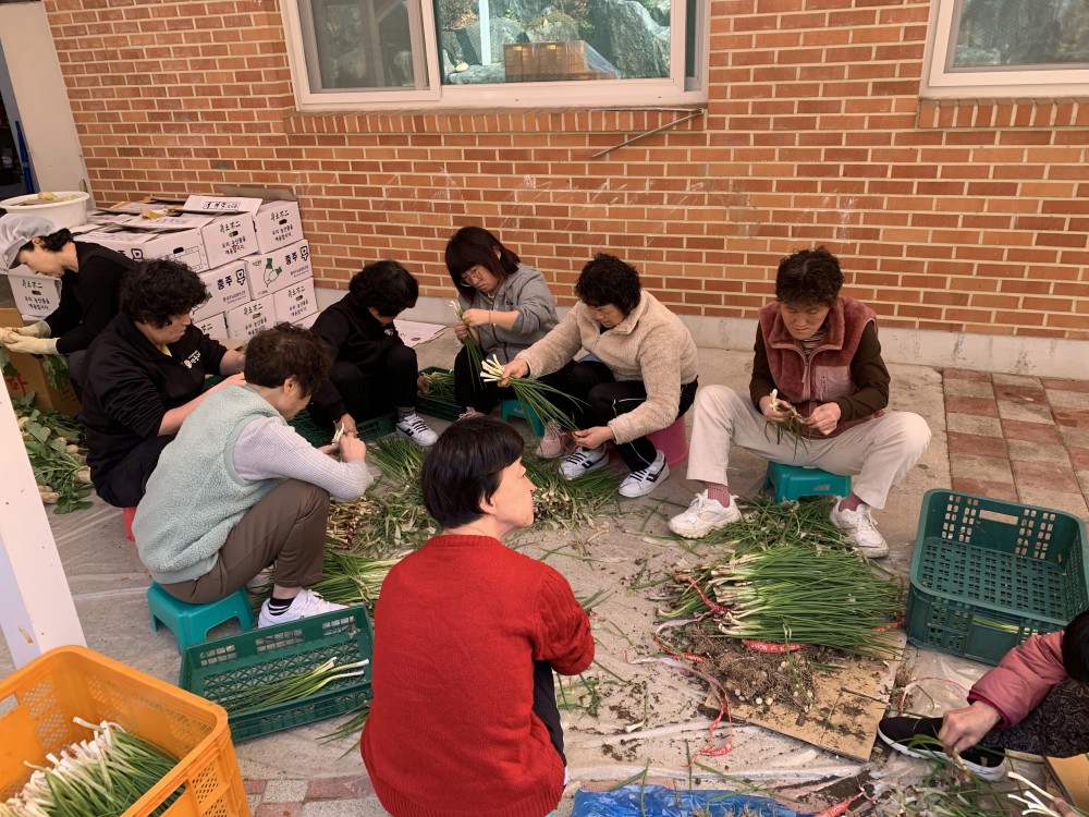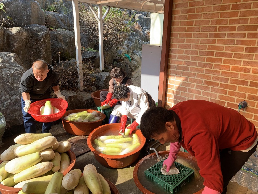 한겨울 양식을 준비하는 날입니다. 모두가 손을 보태 다듬고 썰고 양념 버무리고 어떻게 안 맛있을 수가 있겠어요? 이날 먹는 어묵탕과 굴김치에 보쌈은 일한 뒤 먹는 것이라 더 달고 맛있었어요. 한번 맛보실래요~~