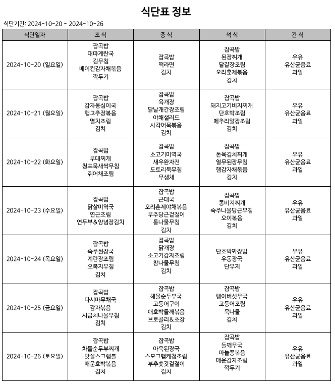 24년 10월 4째 주 식단 페이지 정보 작성자 다래동산 댓글 0건 조회 391회 작성일 24-10-20 00:00 본문 10월 4째 주 식단입니다. 메뉴는 시설 사정 상 변동될 수 있습니다. 목록 이전글24년 10월 5째 주 식단 24.10.27 다음글24년 10월 3째 주 식단 24.10.13 댓글목록 댓글목록 등록된 댓글이 없습니다.