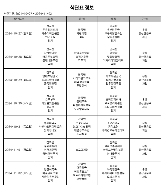 24년 10월 5째 주 식단 페이지 정보 작성자 다래동산 댓글 0건 조회 402회 작성일 24-10-27 00:00 본문 10월 5째 주 식단입니다. 메뉴는 시설 사정 상 변동될 수 있습니다. 목록 이전글24년 11월 1째 주 식단 24.11.03 다음글24년 10월 4째 주 식단 24.10.20 댓글목록 댓글목록 등록된 댓글이 없습니다.