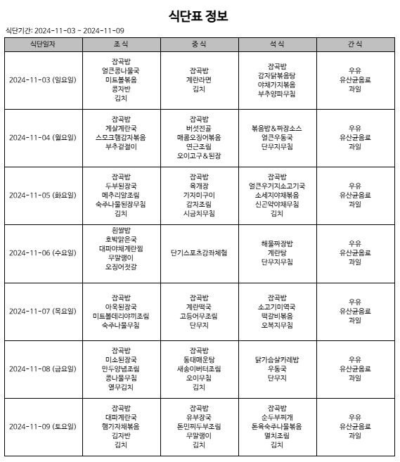 24년 11월 1째 주 식단 페이지 정보 작성자 다래동산 댓글 0건 조회 382회 작성일 24-11-03 00:00 본문 11월 1째 주 식단입니다. 메뉴는 시설 사정 상 변동될 수 있습니다. 목록 이전글24년 11월 2째 주 식단 24.11.10 다음글24년 10월 5째 주 식단 24.10.27 댓글목록 댓글목록 등록된 댓글이 없습니다.