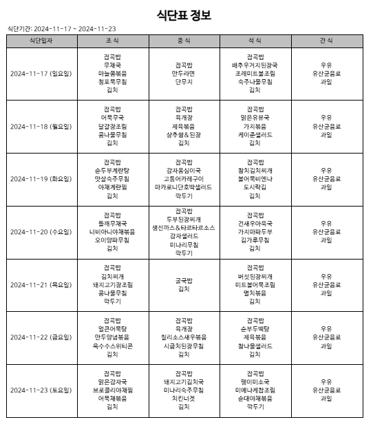 24년 11월 3째 주 식단 페이지 정보 작성자 다래동산 댓글 0건 조회 372회 작성일 24-11-17 00:00 본문 11월 3째 주 식단입니다. 메뉴는 시설 사정 상 변동될 수 있습니다. 목록 이전글24년 11월 4째 주 식단 24.11.24 다음글24년 11월 2째 주 식단 24.11.10 댓글목록 댓글목록 등록된 댓글이 없습니다.