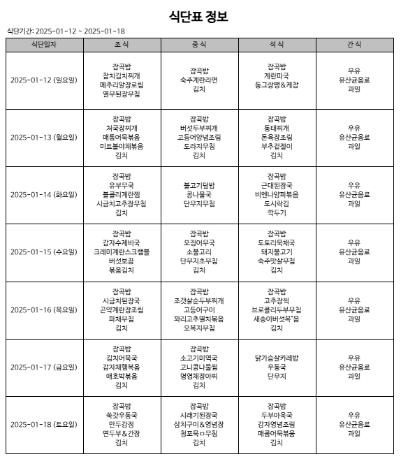 25년 1월 3째 주 식단 페이지 정보 작성자 다래동산 댓글 0건 조회 395회 작성일 25-01-12 00:00 본문 25년 1월 3쨰 주 식단표 입니다. 메뉴는 시설 사정 상 변동될 수 있습니다. 목록 이전글25년 1월 4째 주 식단 25.01.19 다음글24년 12월 5째 주 식단 24.12.29 댓글목록 댓글목록 등록된 댓글이 없습니다.