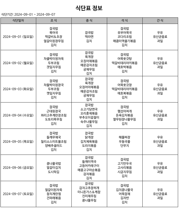 9월 1째 주 식단 페이지 정보 작성자 다래동산 댓글 0건 조회 375회 작성일 24-09-01 00:00 본문 9월 1째 주 식단입니다. 메뉴는 시설 사정 상 변경될 수 있습니다. 목록 이전글9월 2째 주 식단 24.09.08 다음글8월 4째 주 식단 24.08.25 댓글목록 댓글목록 등록된 댓글이 없습니다.