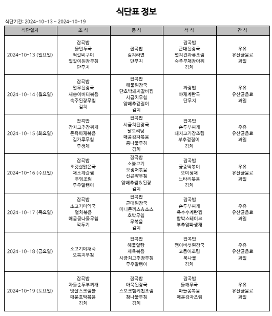 24년 10월 3째 주 식단 페이지 정보 작성자 다래동산 댓글 0건 조회 396회 작성일 24-10-13 00:00 본문 10월 3째 주 식단입니다. 메뉴는 시설 사정 상 변경될 수 있습니다. 목록 이전글24년 10월 4째 주 식단 24.10.20 다음글24년 10월 2째 주 식단 24.10.06 댓글목록 댓글목록 등록된 댓글이 없습니다.
