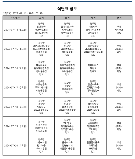 7월 3째 주 식단 페이지 정보 작성자 다래동산 댓글 0건 조회 375회 작성일 24-07-14 17:17 본문 7월 3째 주 식단 시설 사정에 따라 식단이 변경될 수 있습니다. 목록 이전글7월 4째 주 식단 24.07.21 댓글목록 댓글목록 등록된 댓글이 없습니다.