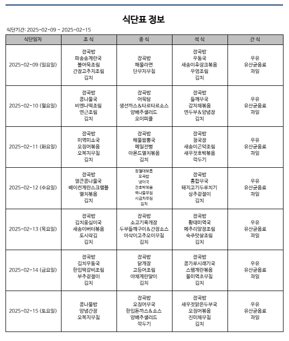 25년 2월 2째 주 식단 페이지 정보 작성자 다래동산 댓글 0건 조회 413회 작성일 25-02-09 00:00 본문 25년 2월 2째 주 식단입니다. 메뉴는 시설 사정 상 변동될 수 있습니다. 목록 이전글25년 2월 3째 주 식단 25.02.16 다음글25년 2월 1째 주 식단 25.02.03 댓글목록 댓글목록 등록된 댓글이 없습니다.