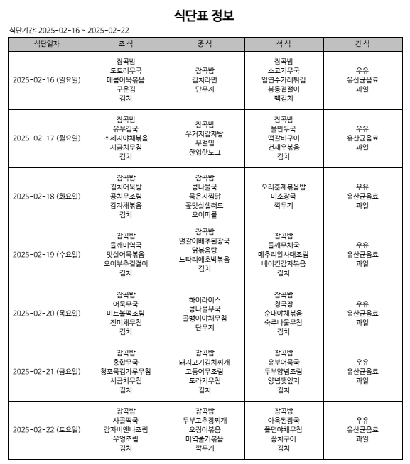 25년 2월 3째 주 식단 페이지 정보 작성자 다래동산 댓글 0건 조회 416회 작성일 25-02-16 00:00 본문 25년 2월 3째 주 식단입니다. 메뉴는 시설 사정 상 변동 될 수 있습니다. 목록 이전글25년 2월 4째 주 식단 25.02.23 다음글25년 2월 2째 주 식단 25.02.09 댓글목록 댓글목록 등록된 댓글이 없습니다.