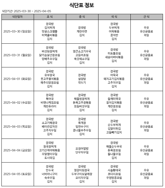 4월 1주 식단 페이지 정보 작성자 다래동산 댓글 0건 조회 291회 작성일 25-03-31 00:00 본문 4월 1 주 식단입니다. 메뉴는 시설 사정 상 변동될 수 있습니다. 목록 이전글4월 2주 식단 25.04.07 다음글3월4주 식단입니다 25.03.24 댓글목록 댓글목록 등록된 댓글이 없습니다.