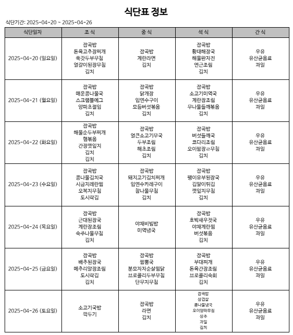 4월4주식단 페이지 정보 작성자 다래동산 댓글 0건 조회 279회 작성일 25-04-21 00:00 본문 4월 4 주 식단입니다. 메뉴는 시설 사정 상 변동될 수 있습니다. 목록 이전글5월 1주 식단 25.05.04 다음글4월3주 식단 25.04.14 댓글목록 댓글목록 등록된 댓글이 없습니다.