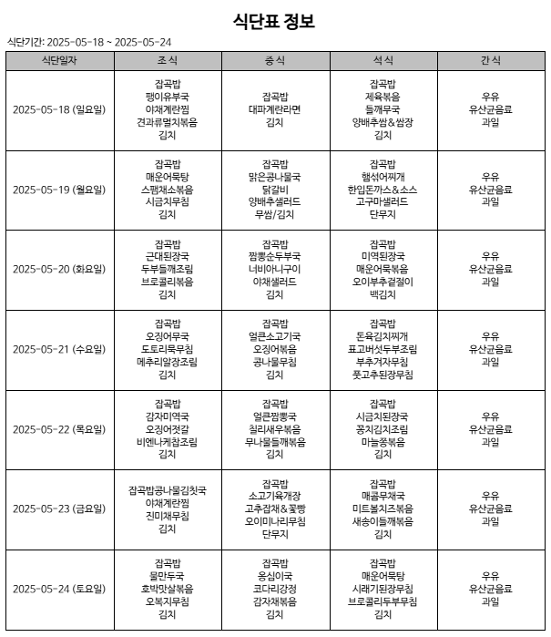 5월 3주 식단입니다 페이지 정보 작성자 다래동산 댓글 0건 조회 241회 작성일 25-05-18 00:00 본문 5월 3 주 식단입니다. 메뉴는 시설 사정 상 변동될 수 있습니다. 목록 이전글5월 4주 식단입니다 25.05.25 다음글5월 2주 식단입니다 25.05.11 댓글목록 댓글목록 등록된 댓글이 없습니다.